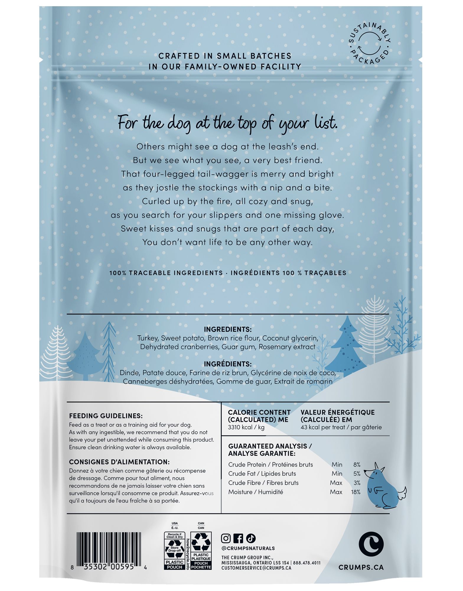 Turkey, Sweet potato, Brown rice flour, Coconut glycerin, Dehydrated cranberries, Guar gum, Rosemary extract
