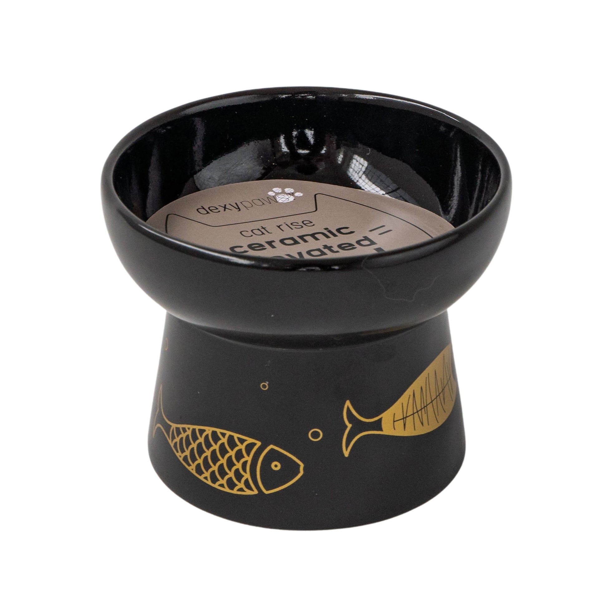 Dexypaws Raised Ceramic Cat Bowl, Black with Gold Fish Cat 7oz