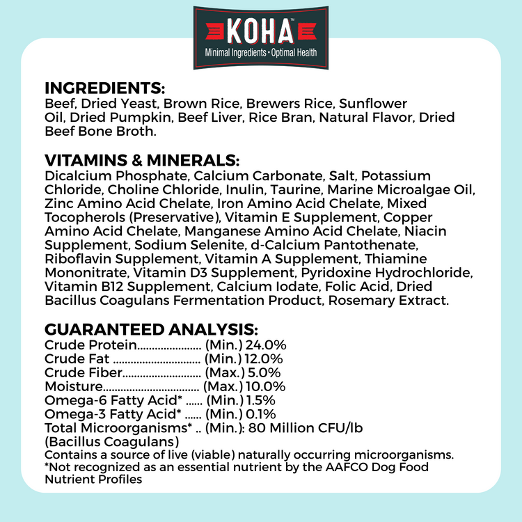 Beef, Dried Yeast, Brown Rice, Brewers Rice, Sunflower Oil, Dried Pumpkin, Beef Liver, Rice Bran, Dicalcium Phosphate, Natural Flavor, Calcium Carbonate, Salt, Dried Beef Bone Broth, Potassium Chloride, Choline Chloride, Inulin, Taurine, Marine Microalgae Oil, Zinc Amino Acid Chelate, Iron Amino Acid Chelate, Mixed Tocopherols (Preservative), Vitamin E Supplement, Copper Amino Acid Chelate, Manganese Amino Acid Chelate, Niacin Supplement, Sodium Selenite, d-Calcium Pantothenate, Riboflavin Supplement, Vitamin A Supplement, Thiamine Mononitrate, Vitamin D3 Supplement, Pyridoxine Hydrochloride, Vitamin B12 Supplement, Calcium Iodate, Folic Acid, Dried Bacillus Coagulans Fermentation Product, Rosemary Extract.