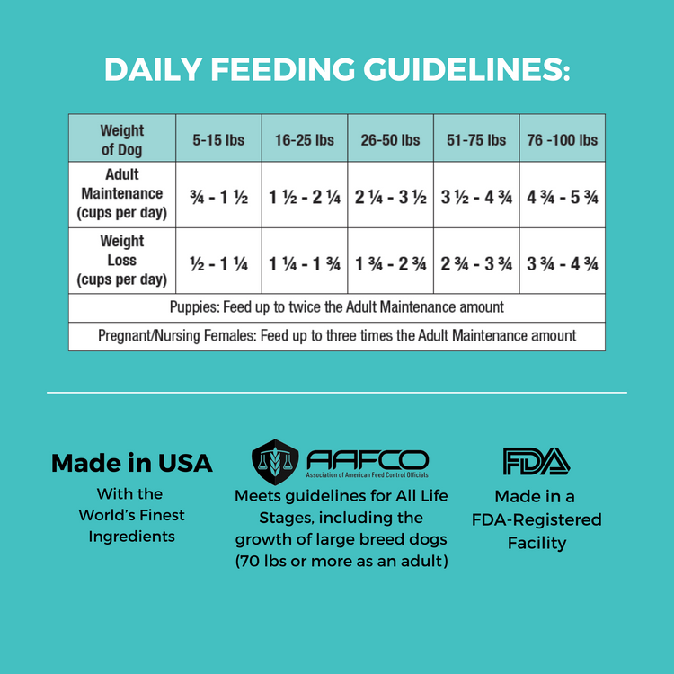 Amount of food your dog requires will depend on activity, age, environment, and breed. Always provide access to clean fresh water. Store in a cool dry place at room temperature in a sealed bag or container. Keep away from moisture and use within 60 days of opening to ensure freshness.