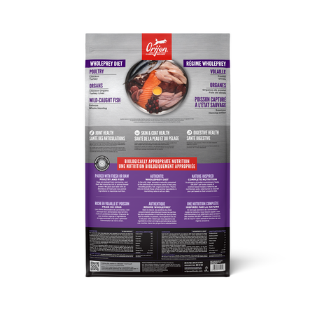 Help your large breed dog thrive with a Biologically Appropriate diet packed with whole animal ingredients. ORIJEN™ Large Breed Adult diet is tailored to the unique needs of large breed dogs, and it helps support key health benefits including Joint Health, Skin & Coat Health and Digestive Health. Crafted with 85%* quality animal ingredients like free-run** chicken and turkey, and wild-caught fish, this recipe is rich with nutrients that help your large breed dog be their best. Packed with WholePrey animal ingredients like organs, this recipe is made with the most nutrient-dense, succulent parts of the prey to deliver the nourishment large breed dogs need. The result is a diet for your canine companion that is beyond comparison.