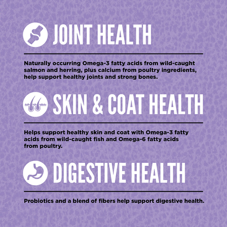 - Helps support your large breed dog’s joint health with naturally occurring Omega-3 fatty acids from wild-caught herring and salmon, plus calcium from poultry ingredients.