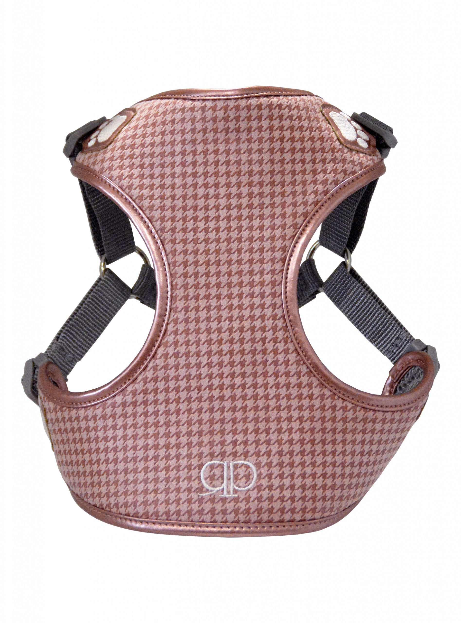 The Melrose Houndstooth harness is named after the small town of Melrose in the Scottish Borders historically in Roxburghshire, which was re-founded in the early 12th century and is one of the most beautiful monastic ruins in Great Britain. Melrose, the heart of the Scottish King Robert the Bruce inspired the regal composition of the blush tones seen throughout the lavish, plush fabric. The alluring, metallic rosette leatherette ribbing touches on the dusty rose arrangement delicately accented by the blush pink embroidery. The beloved Shih Tzu dogs were favourites of imperial royals because they were so prized for their beauty and their signature underbite complimenting the houndstooth.