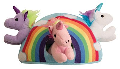 Delight your curious pup with this Hide & Seek Rainbow. Perfect for dogs who need mental stimulation, this interactive toy is actually four toys in one: a plush rainbow and three squeaky unicorns. Each unicorn fits inside of the rainbow for your dog to discover and remove. Once your pup has completed their adorable mission, put the unicorns back inside the rainbow or play with each toy individually.